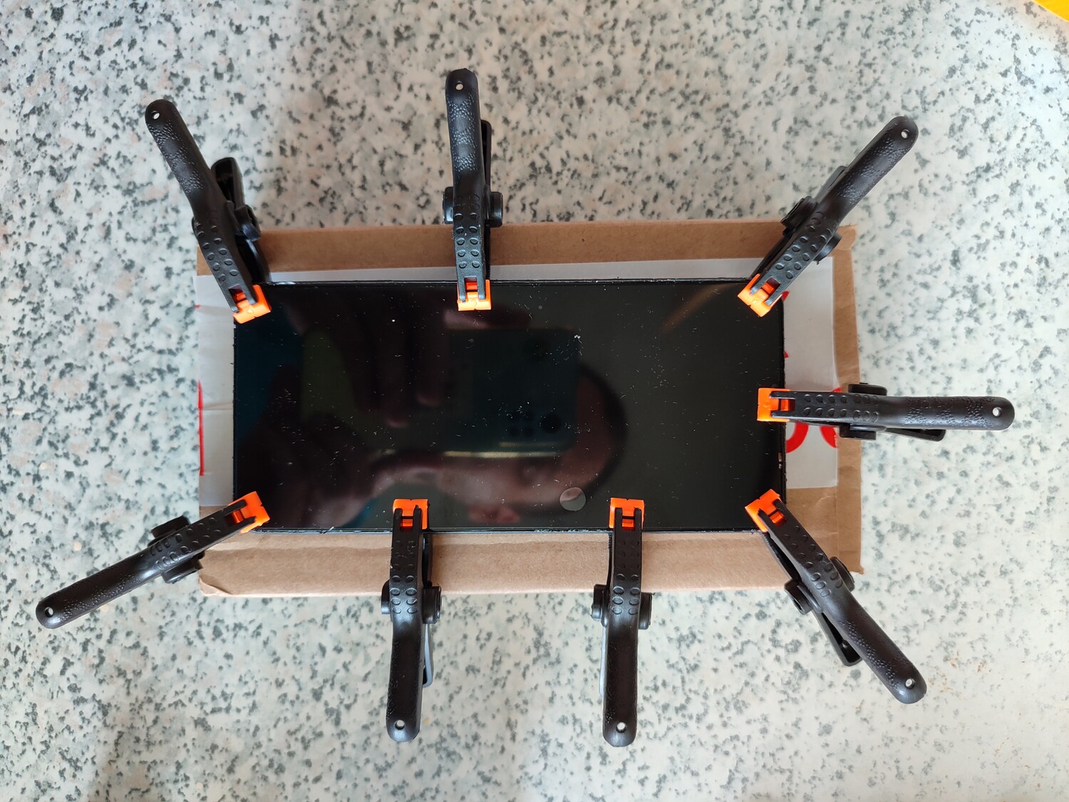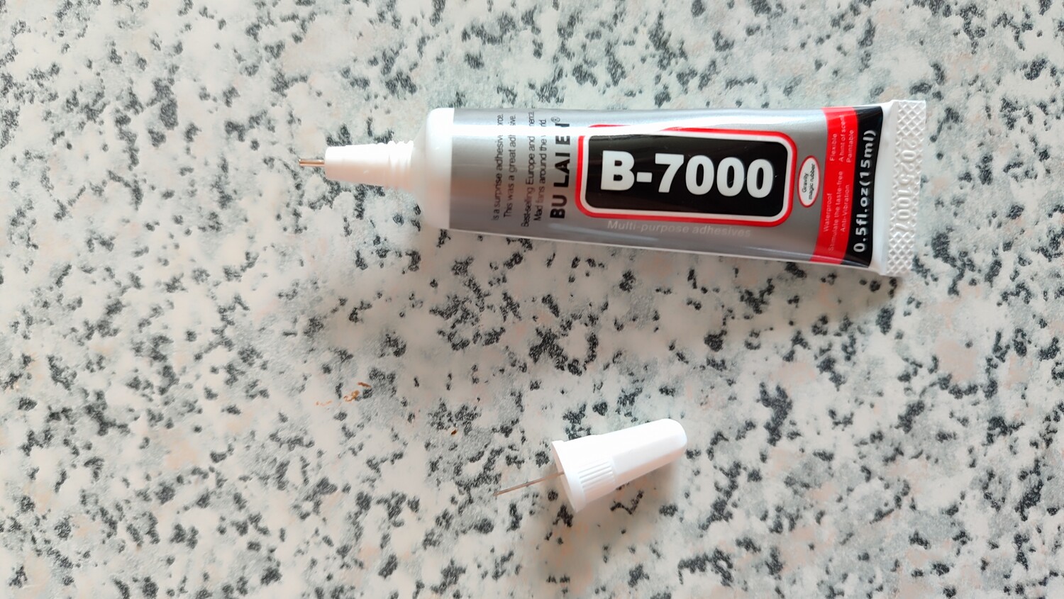Нанёс по периметру корпуса клей (B-7000) и по периметру нового экрана. Несколько капель клея добавил по углам и по центру, для надежности.